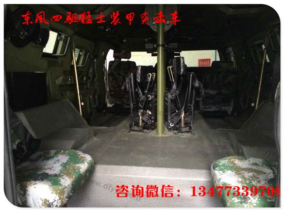 猛士裝甲內(nèi)飾:同樣受保密制度限制,沒有第一時間得到猛士裝甲版內(nèi)飾照片,與猛士基礎(chǔ)車型相仿,因?yàn)橹兄靡,車?nèi)中央通道前部被發(fā)動機(jī)所占據(jù),后排座的中央通道形成一個平臺,可放置貨品或?yàn)檐図斘淦骰咎峁┤藛T操作平臺。請注意上下兩幅圖的猛士裝甲版車門內(nèi)側(cè)特寫的不同。